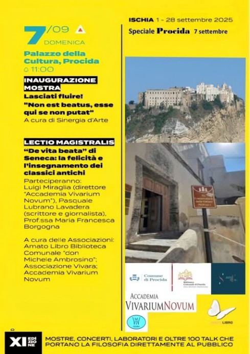 Nell'ambito del Festival della Filosofia organizzato dall'associazione "InSophia" che si tiene a Ischia dal 2015, si è svolta il 7 Settembre 2025 per la prima volta a Procida, una sessione "speciale Procida" con l'intervento di Luigi Miraglia, presidente dell'Accademia Vivarium Novum, che ha tenuto una Lectio Magistralis dedicata a Seneca e la sua "De Vita Beata" la felicità e gli insegnamenti dei classici antichi.